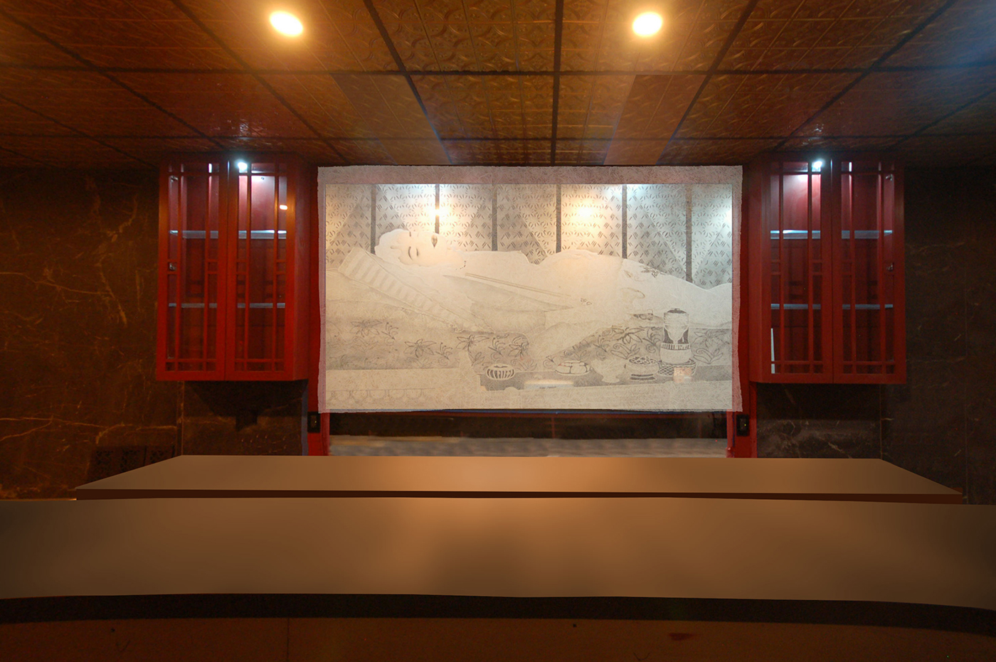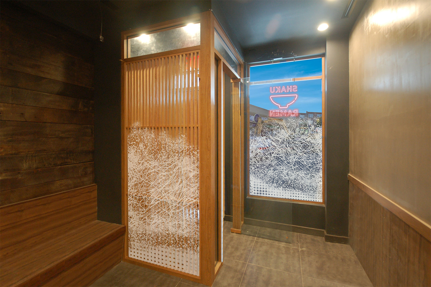 Precious Pieces designed Washi Parchment window shades for a Ramen Restaurant, NYC. One-of-a-kind Washi Parchment patterns throughout the windows is perfectly complementary to the Japanese cuisine and Speakeasy at night time