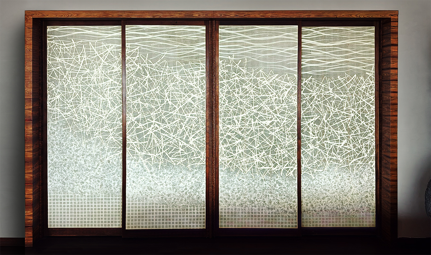 Precious Pieces/Hiro Odaira was commissioned to create a full-height Art Washi Parchment panel “Mizushibuki, Water Splash,” to be used as partition door for Playa Vik; a luxury hotel in Uruguay, Latin America.