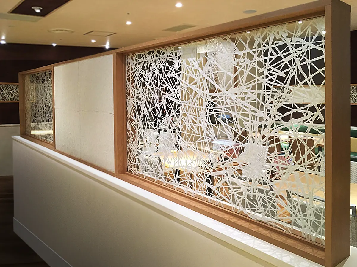 Washi wall panelsand partitionsare used in a modern, upscale restaurant with natural elements. The light coming through the perforated Washi gives a calm and relaxed feeling to the customers. The delicate Washi patterns provide contrast to the sleek lines of the interior design. It is a true marriage of the old and the new. KUMO was used in this project.