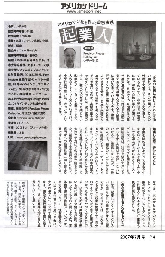 「アメリカンドリーム」amedori.netの「起業人」コーナーでPrecious Pieces Gallery Inc. 小平伸浩社長が紹介されました。